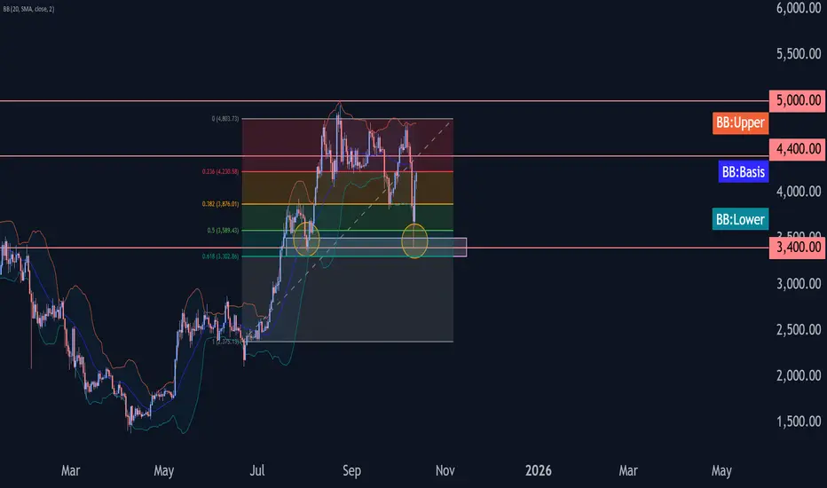 Ethereum cryptocurrency recently reversed up from the support zone between the key support level 3400.00 (which also reversed the price in August), lower daily Bollinger Band and the 50% Fibonacci correction of the upward impulse from June.