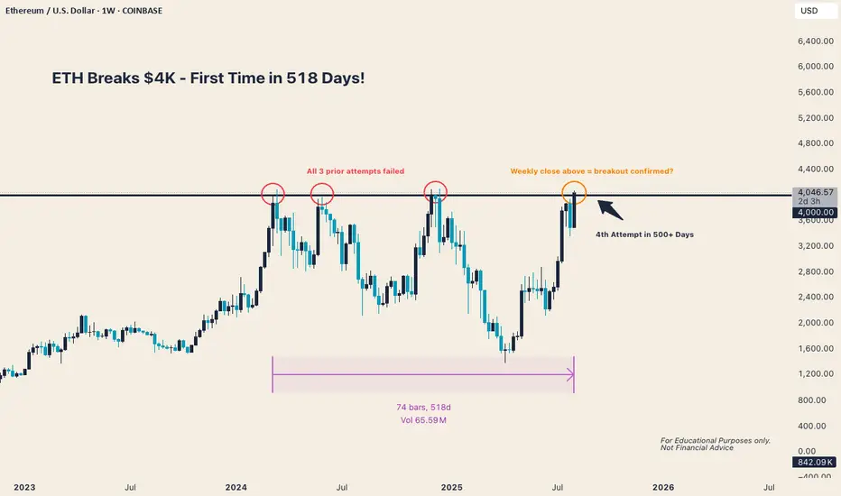 After 3 failed breakout attempts over the past 518 days, ETH is once again testing a key macro resistance level.