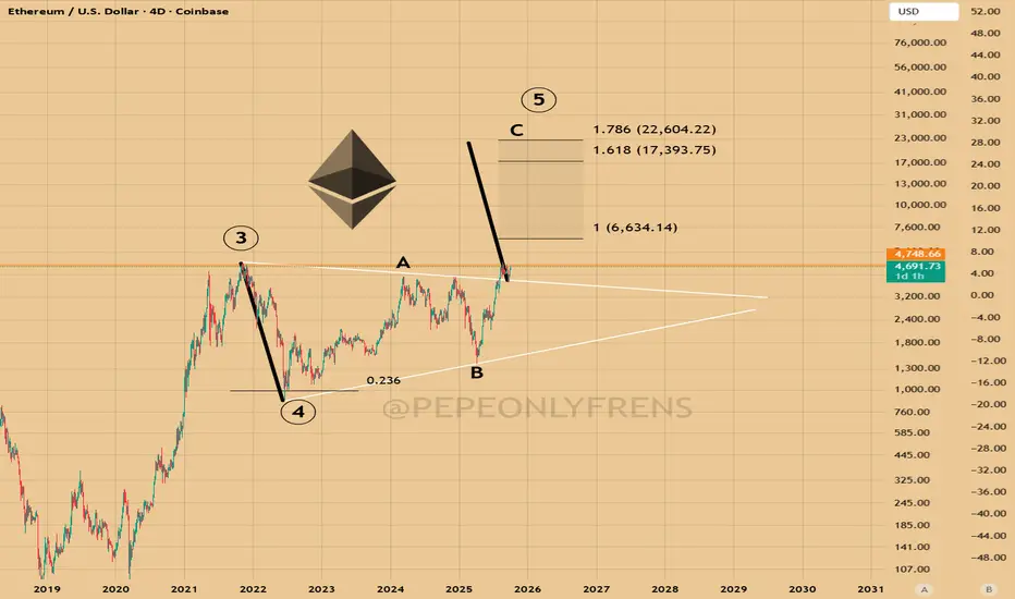 Wave count showing a bullish uptrend for ETH. Pushing upward in a larger uptrend.
