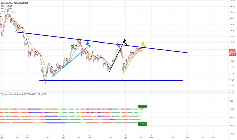 Here we have Ethereum on the log chart and as the trend line and hammers show this is the third time previous support has flipped to resistance and so at the very least some sort of down trend is to be expected.