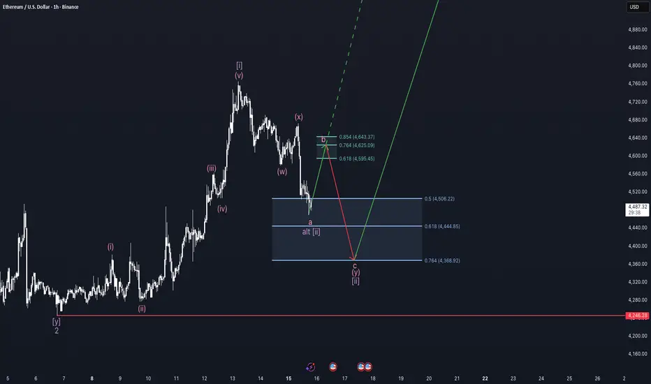 Ethereum is currently in the second wave of the minute cycle within the larger third wave unfolding in the minor cycle.Zooming into the fractal structure of the mentioned second wave, we can easily recognize the double three pattern as shown on the chart. My primary expactation therefore is a combination of a flat structure as a minuette wave w and a following zig zag a minuette wave y. I have chosen this scenario, because it's typical for altcoins to retrace their wave two a bit deeper then assets do normally. Also, the flat structure hasn't corrected this second wave too far, making a larger pullback likely. The zig zag probably made his subminuette wave a and should retrace now to levels of around 4.6k. The alternative scenario would be, that this second wave is already completed and with that we would be looking forward to 5k. For the alternative scenario to be completed, we need ETH to climb higher than the previous high of the minuette wave x.