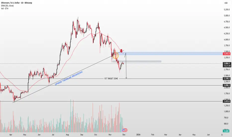 ETH is trading around $3,000 after breaking below its long-term upward trendline, showing a shift in market structure. Price attempted a retest of the broken trendline and the 50-day EMA ($3,415) but failed to reclaim it, forming rejection wicks in the highlighted zone a classic bearish retest.