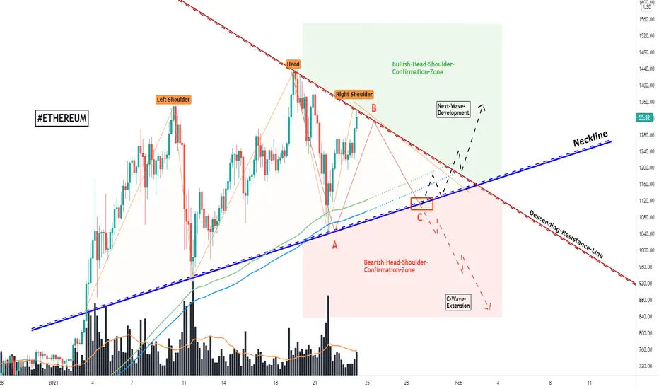 As when looking at my chart we can watch there how Ethereum is now developing this huge head-and-shoulder-formation with the neckline marked in blue and the left shoulder as well as head already completed in the schedule, the recent times Ethereum is about to form the right shoulder within the structure in which it already moved to the upside and directly into the descending-resistance-line marked in my chart in red from where a pullback to the downside is highly likely which should also be expected here, this pullback will confirm to the wave-development Ethereum is currently within with the wave C remaining as it is marked in my chart, this wave C will first move into the neckline from where the further conclusions will be made.
