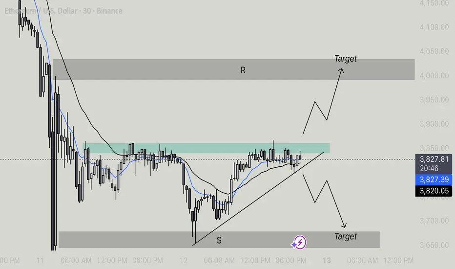 If Ethereum breaks and holds above the $3,850 resistance, it could trigger a move toward the next resistance target near $4,000–$4,050. This would confirm a breakout from the ascending triangle pattern.