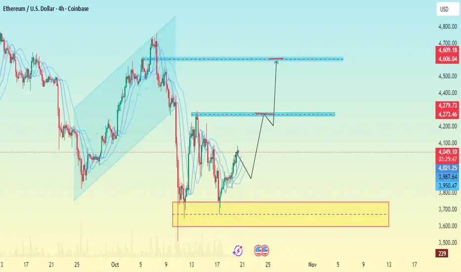 Support Area (yellow zone): Roughly $3,600 – $3,750, showing the last strong demand zone where price previously reversed.
