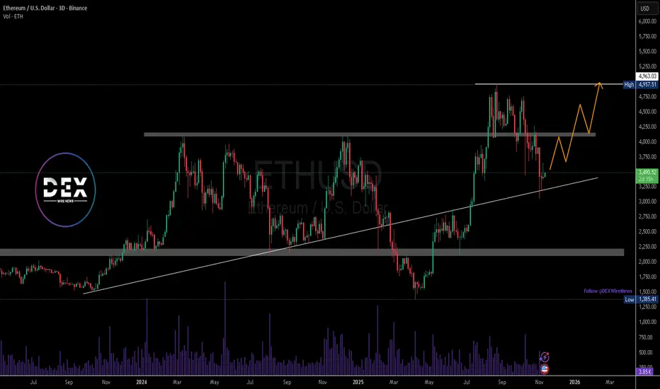 Technically, ETH/USD has bounced from the $3,200 support zone, aligning with a long-term ascending trendline. The chart shows potential for a sustained push toward the $4,150 resistance before retesting and targeting the $5,000 high. A clear daily close above this level would confirm a continuation of the larger bullish structure and could open the door to new all-time highs in 2026 if macro tailwinds persist.