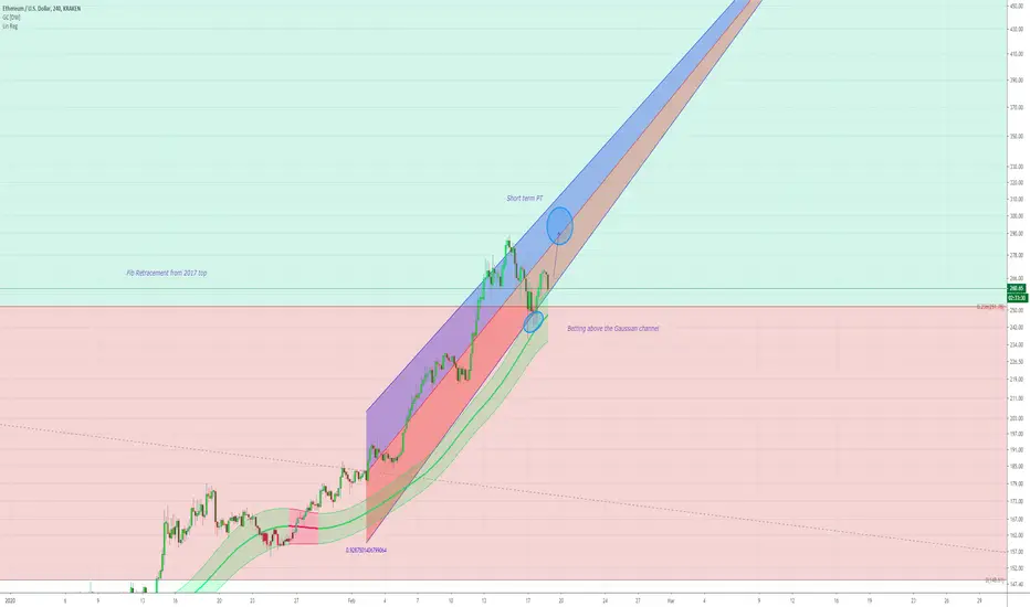 Stronk LR uptrend, 4H chart, currently sitting above the Gaussian channel, looking for a bounce off the top of the channel to further the uptrend. Fib level is a strong support from the 2017 ATH. Short term shot.
