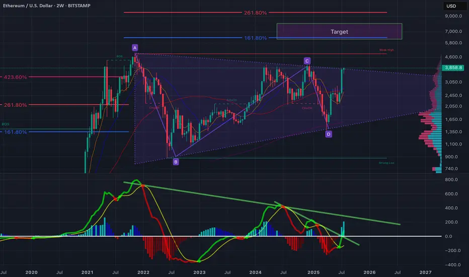 Ethereum is showing a significant breakout setup after years of consolidation within a large symmetrical wedge structure (A–B–C–D pattern). The price has just tested the upper boundary of the wedge, and momentum indicators suggest a potential mid-term bullish continuation.