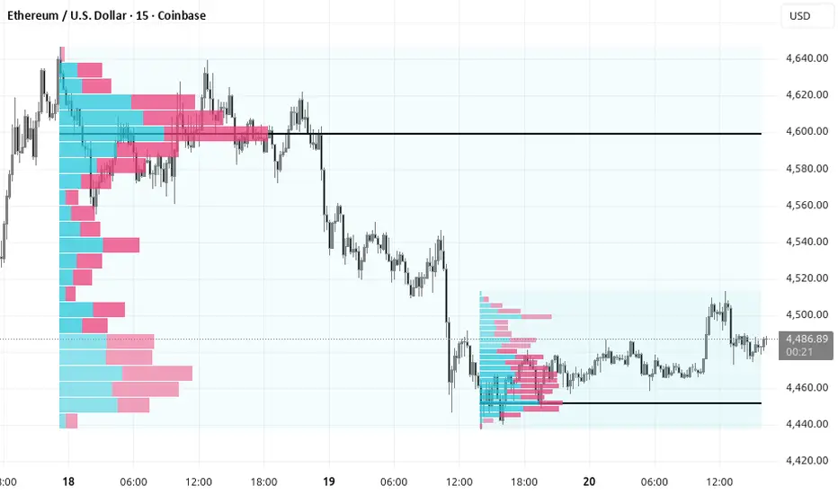 If a bigger swing has its POC at a higher price and a lower swing has its POC at a lower price on a 15-minute ETH/USD chart, price is generally more likely to be attracted to the higher volume areas (POCs) rather than low-volume areas. The POC acts as a magnet where buyers and sellers find equilibrium, and price may return to or consolidate near these high-volume nodes.
