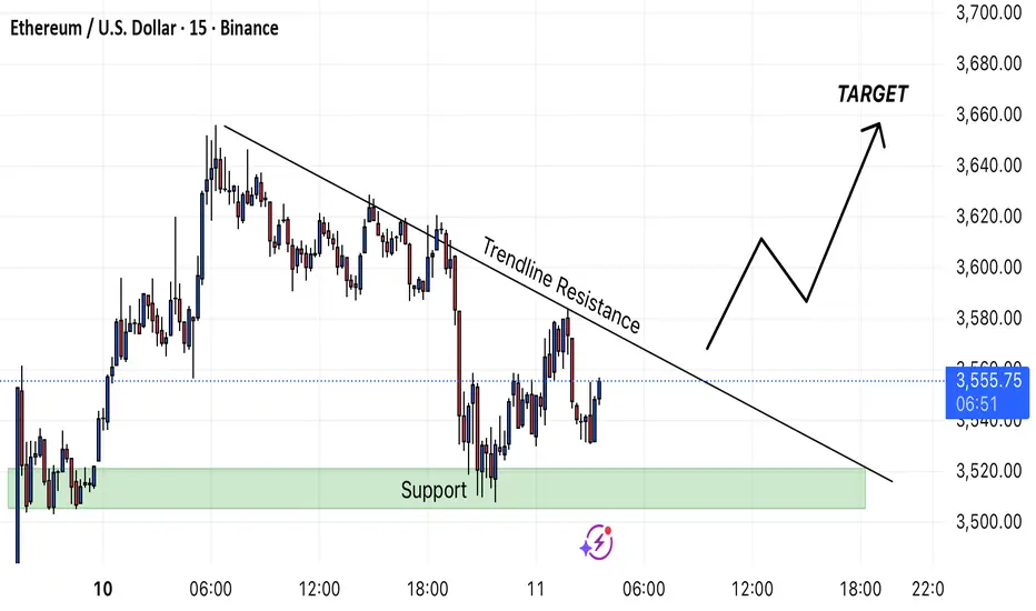 Ethereum is currently consolidating near the $3,550 level after a short-term pullback. Price is moving within a descending trendline acting as dynamic resistance, while the green zone around $3,510–$3,530 is providing a strong support base.
