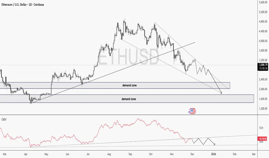ETH continues to make lower highs and lower lows inside a descending wedge.