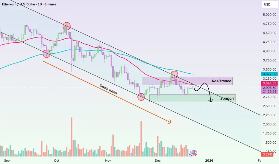 Looking at the ETH daily chart, the current picture is quite clear: the primary trend remains bearish, and the recent upside move should only be viewed as a technical rebound.