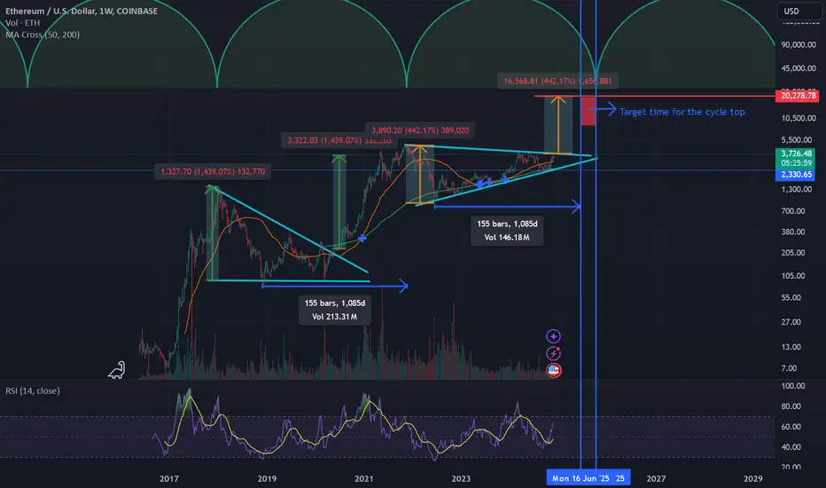 Pattern: Ascending triangle is formed in weekly time frame for Ethereum (2022-2024). The triangle pattern was formed in the previous cycle (2018-2020).