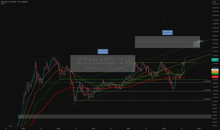 Based on this parallel channel and 2x in length the target would be around 7-8K. Another parallel channel can be drawn within the bottom half. The 2024 triple top resistance should be the prominent bias here for confirmation on retest.