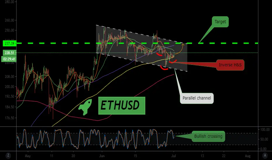 Ethereum trades on a parallel channel against USD pair. It showed a bullish crossing on Stochastic. The chart also shows an inverse head and shoulders pattern, which would take the price to 237.39USD level. We may long here.