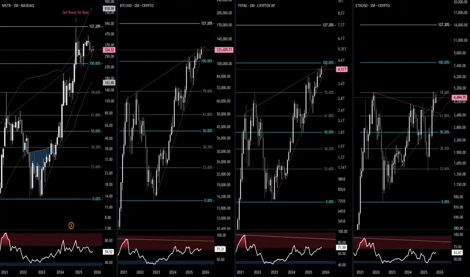 By request of weslad, here is the Fibonacci extensions for MSTR, BTC, TOTAL and ETH. Obviously, this is just a tool to estimate potential price tops for the cycle. Big upside potential here!