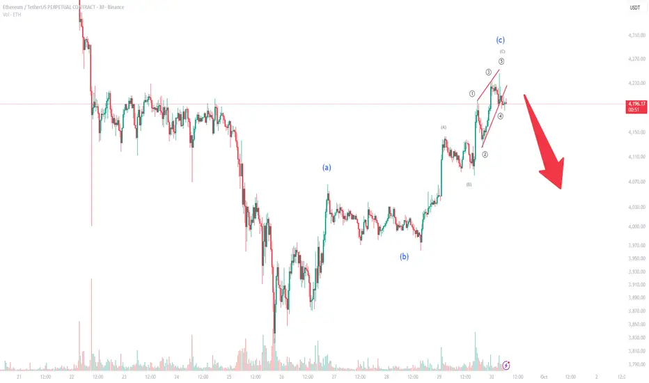 Ethereum has recently completed the final leg of its ABC corrective structure, with the C-wave forming as a clear ending diagonal. This technical pattern often signals exhaustion in the current upward move and hints at a potential reversal.