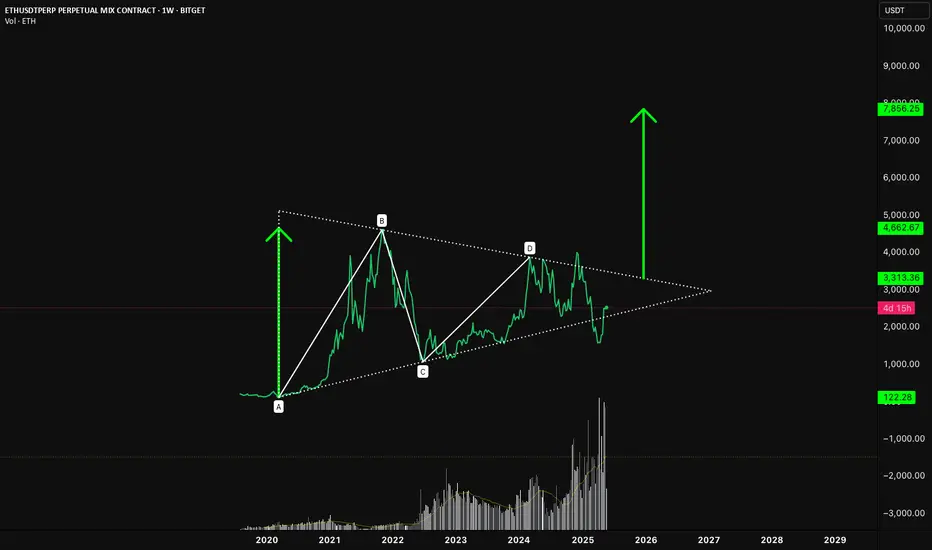 Since the 2021 highs, Ethereum has spent years grinding sideways, printing what now looks like a textbook symmetrical triangle. Labeled here as an ABCD compression pattern, this structure has been tightening since the macro top (B), slowly building energy within narrowing volatility.
