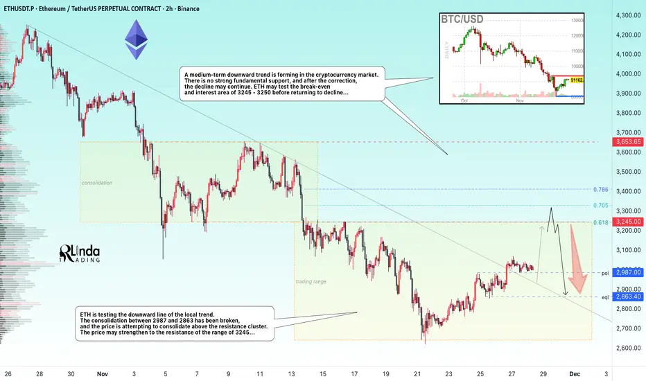 A breakout is forming and an attempt is being made to keep the price in the long zone. If the bulls keep the price above 2897 after retesting support, the price is likely to strengthen to the resistance range of 3245... However, a false breakout (liquidity capture) of key resistance may remind the market of the relevance of the downward trend...