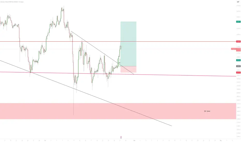 The trade setup displayed on the chart is a long position with a favorable risk-to-reward ratio — entry after the breakout and retest, stop loss below the FVG and trendline area, and target near the upper resistance zone. As long as price remains above the retested breakout zone, the bias stays bullish and a continuation toward higher levels is likely. However, if the market closes back below the broken trendline or dips into the deeper red demand zone, it would invalidate the bullish scenario and signal renewed bearish pressure.