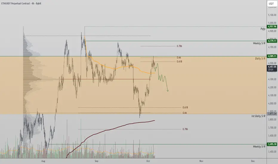 Ethereum’s recent rally has brought price action into a crucial resistance zone on the higher timeframes. The $4,580 region has repeatedly acted as a key level of rejection in previous attempts and now coincides with the 0.618 Fibonacci margin. As price approaches this zone once again, traders are watching closely to see whether Ethereum can break through with volume confirmation or if another rejection will initiate a short-term retracement before a broader continuation move.