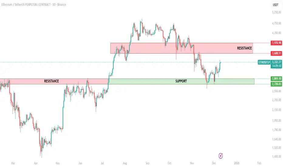 Ethereum has bounced strongly from the key support zone at 2728–2869 and is now pushing upward. This level has acted as a reliable demand area throughout the year, and the latest reaction confirms buyers are active again.