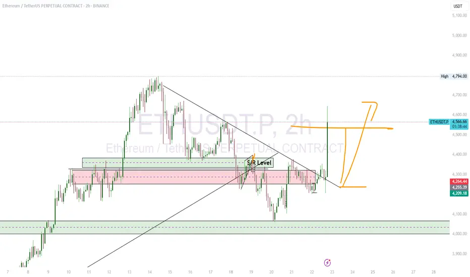 ETHUSD ETH/USDT shows a strong upward move after a period of consolidation and a breakout from a descending trendline.