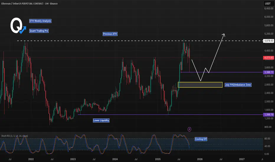 Ethereum (ETH/USD) on the weekly chart recently retested the July FVG imbalance zone around $3,388.13, showing a strong bounce after hitting lower liquidity near $1,600.00. The bullish scenario points to a potential move toward the previous ATH at $4,878.60 if momentum builds, especially with Stoch RSI cooling off from overbought levels. Conversely, watch for a bearish pullback if resistance holds at $3,388.13, targeting lower liquidity again—key levels to monitor are $3,388.13 and $1,600.00!