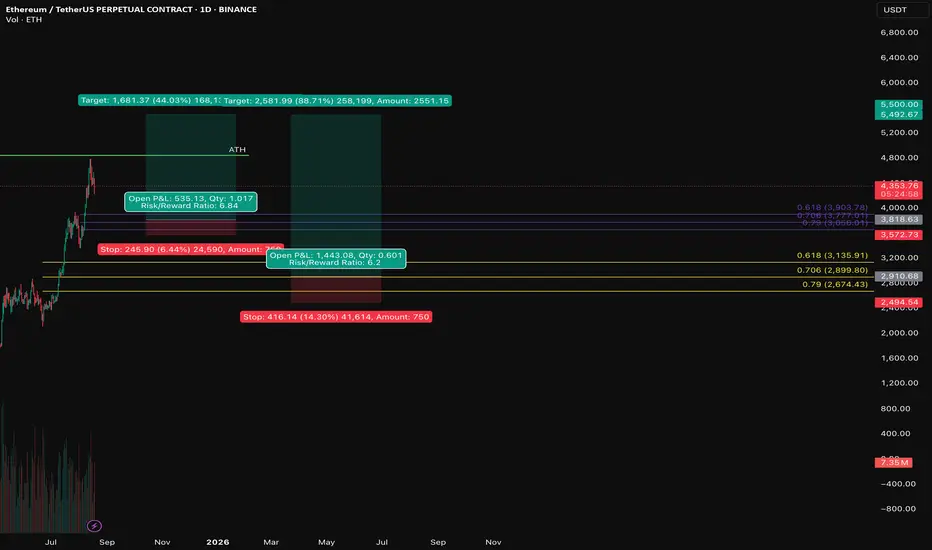 ETH looks like it wants to respect the 4H fibs for now. Daily fibs stay on deck as the “backup parachute” if price retraces deeper. Watching ATH → breakout → 5.5k zone as the bullish path.