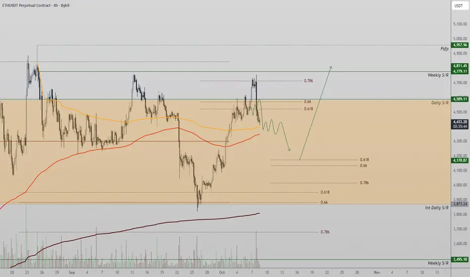 Ethereum re-entered its prior trading range after a failed breakout above $4,589. Despite the retracement, market structure remains bullish, with a potential higher-low formation developing near the 0.618 Fibonacci zone.