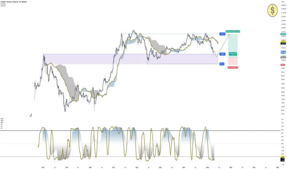 Ethereum is currently approaching a major support zone between $1,440 and $880, a level that acted as strong demand during previous market cycles. Price is currently below the Ichimoku cloud (Span A: $2,433 | Span B: $2,746), and the overall structure remains bearish unless price starts to break above recent swing highs.