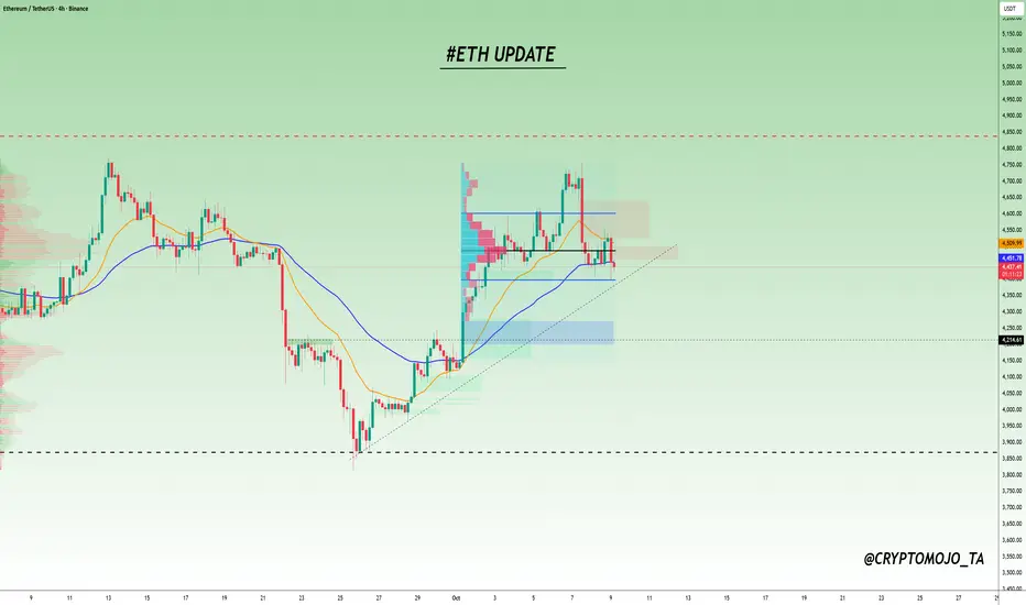 #Ethereum is facing significant resistance between $4,450 and $4,550. After rejecting the recent local highs, it’s currently holding the 55 EMA (green) as short-term support. However, it’s getting squeezed between the 21 EMA (yellow) above and a high-volume node on the Volume Profile, which acts as a heavy liquidity zone.
