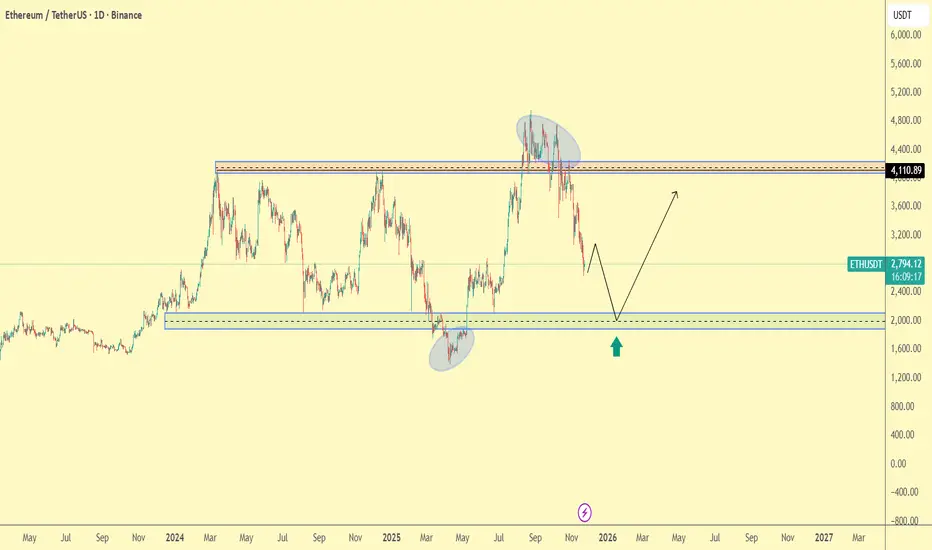 Ethereum is currently in a corrective phase after a significant rally and repeated rejections from major resistance levels. The structure suggests price is approaching a critical zone that could determine ETH’s medium- to long-term direction.