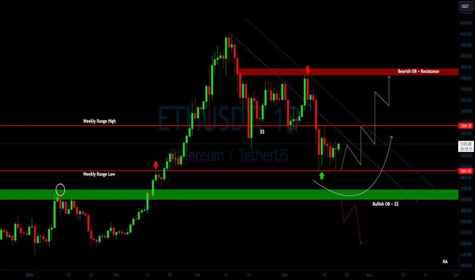 💎 Another intriguing scenario to consider is if #ETHEREUM fails to break the weekly low and drops below it. In such a case, our point of interest shifts to the lower bullish order block (OB) at $2606. There exists a high probability that the price will sustain momentum at this level and embark on a bullish move, potentially mitigating the impact of the bearish order block.
