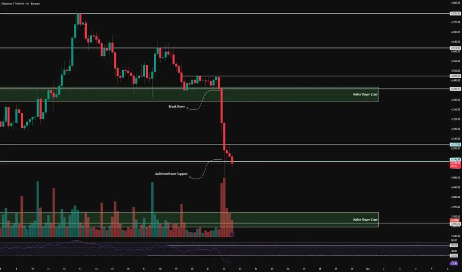 👀 On the 4H timeframe for Ethereum, we can see that after breaking below its maker-buyer zone, ETH moved down toward lower support levels, experiencing a **7% drop** — an unexpected move that even pushed major holders to sell. Ethereum is now sitting at a **multi-timeframe support zone**, and if this level is lost, it could head toward the next lower maker-buyer area, where we’ll need to observe how price reacts.