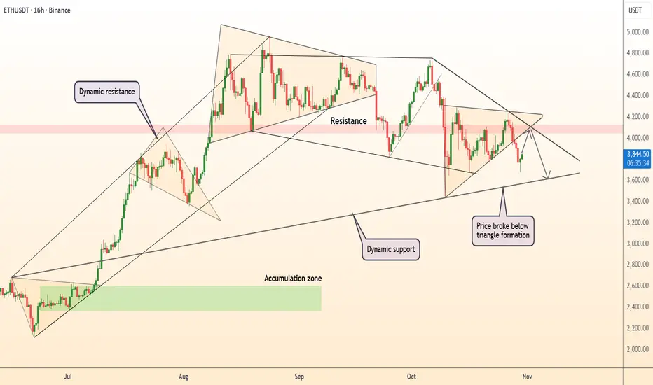 ● ETH/USD broke below a triangle formation, confirming a bearish continuation from the dynamic resistance area near $4,200.