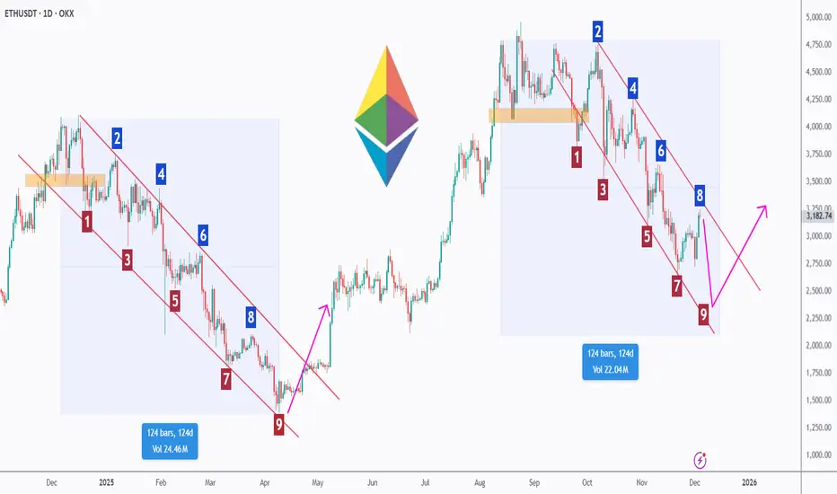 🌊Both cycles followed a clean 1-to-9 wave sequence inside a falling channel before ETH broke out aggressively. And right now, ETH is completing the same exact structure, approaching wave 9 once again.