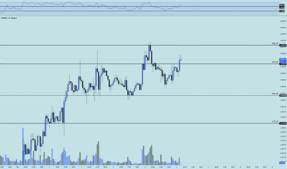 👀 On the 1-hour timeframe, Ethereum recovered after yesterday’s drop, moving toward its support zone, where it consolidated briefly before forming a short-term trigger at $4,549. This level was then broken in a single 1-hour candle, and ETH is now stabilizing above it — confirming the trigger activation. A new resistance has now formed around $4,606, and a breakout above that level would activate another bullish trigger for Ethereum.