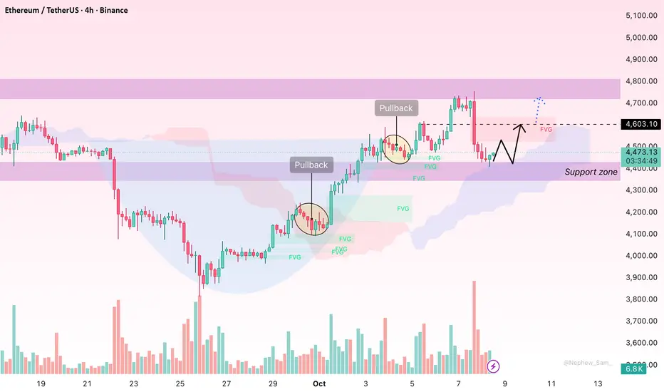 Hello everyone, after reaching the recent peak near $4,500, Ethereum is showing signs of a mild correction. However, the decline quickly stabilised around $4,440, where buyers re-entered, and the Ichimoku cloud continues to provide solid support on the 4H chart.