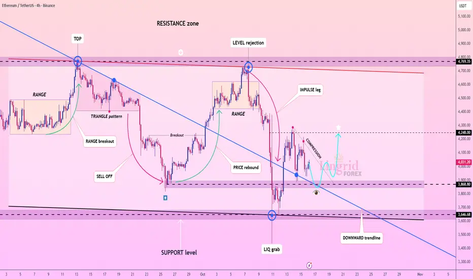 ETHUSDT rebounded sharply from the liquidity grab near 3500, signaling the defense of the major support level after a deep sell-off. The structure now shows compression just below the downward trendline, hinting at a potential bullish breakout setup. If price sustains above 3900, it could trigger an impulsive rally toward 4250. Momentum remains constructive, and the recovery phase suggests a possible reversal if buyers maintain control.
