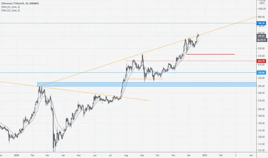 Market is reacting to resistance trend line drawn from the FEB-2020 HIGH. Looks like a rising wedge that could facilitate a bear leg to re-test previous lows. I have my doubts we will see a big pullback mainly because of the strength of the preceding trend but don't take my word for it. A target for such a pullback would be that 480 level (good buy level for me). If we see a weekly close above 650, increased chances of market seeing 800 first before any non-trivial pullback.