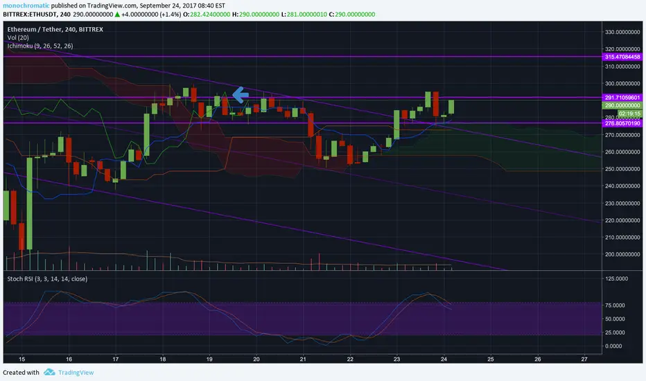Of these four indicators, the first three have been met, but the lagging span is still in-line with the current price, which means the overall trend hasn't changed much in the last week. Once the lagging span is above the price line, all four criteria will be met, and a long position is recommended based on the ichimoku. If the current trend continues, this should be around 300 USD.