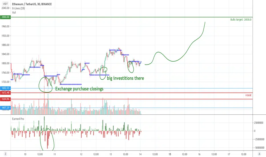 Hi friends. ETH picture is simple like Bitcoin. We have big volume of closings purchased by exchange and big investitions after. So my opinion long will continue until 2000.0. Volume analisys thanks to "Earned Pro" script, link below. Follow me.