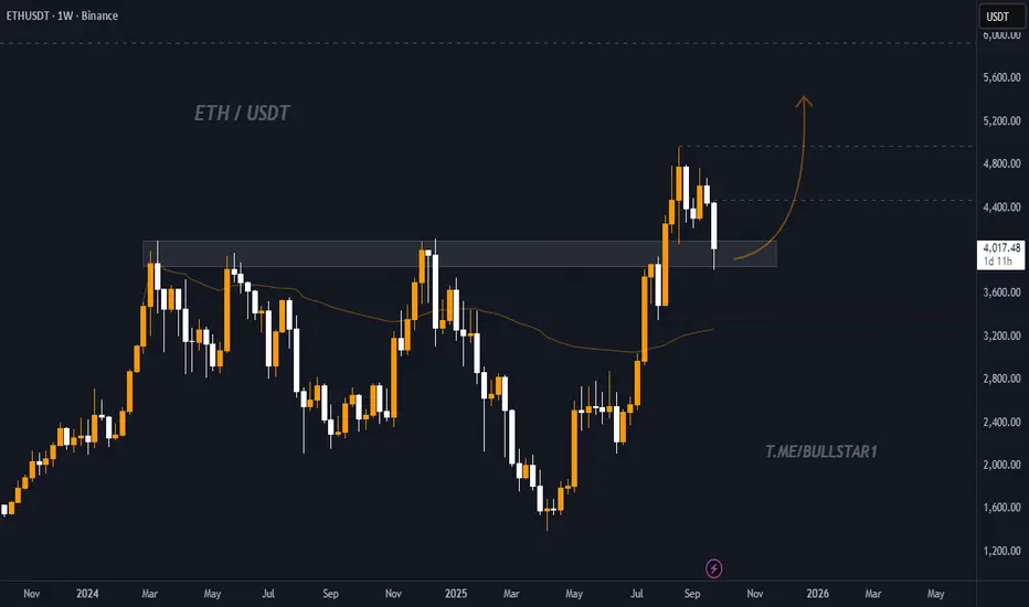 Ethereum (ETH) on the 1W chart has pulled back to a key resistance-turned-support zone around 3,800 – 4,000 USDT. This level also aligns with the 50-week moving average, creating a strong liquidity and demand area.