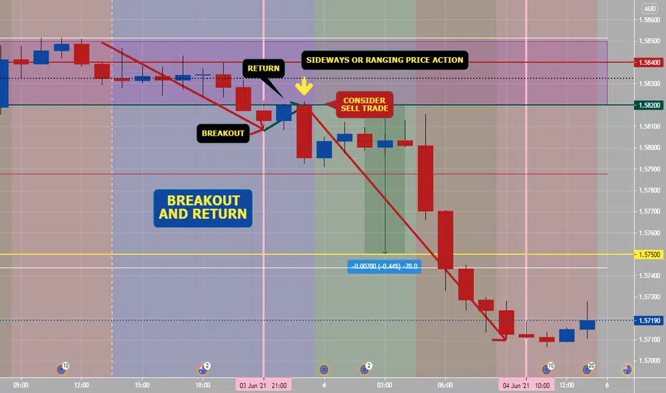 After sideways price action, price action breaks out of range suddenly which you should let happen, then price action returns back into range- this is time that a trader should consider getting into a new trade (example: chart trade is sell break out and return trade).