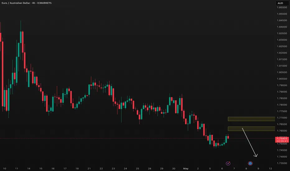 * 🟥 Primary Sell Zone: 1.7600–1.7630 (FVG + OB + previous demand flip zone + fib 61.8% of last swing drop)