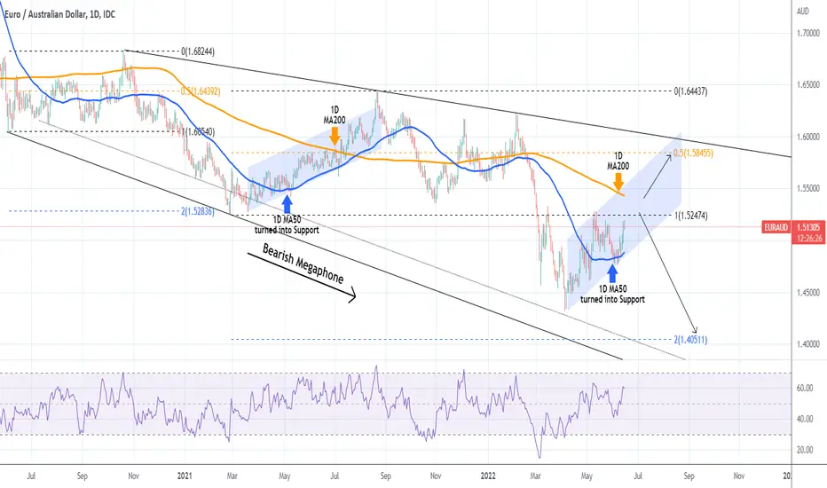 The EURAUD pair has been trading within a long-term Bearish Megaphone pattern but since the April 05 bottom, it has established a Channel Up on the medium-term. A similar Channel Up pattern was what took the Megaphone to its previous Lower High.