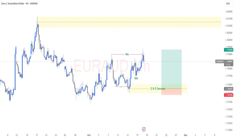 Price has printed a clear Break of Structure (BOS) to the upside, establishing bullish order flow on the 4H timeframe. After the BOS, the market rotated lower to sweep internal liquidity (SSS) and tag the last down-close candle the DBR Demand that sponsored the bullish impulse.