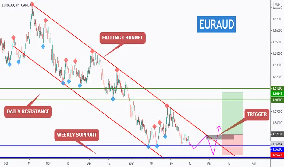EURAUD is approaching strong support in blue from Weekly so we will be looking for buy setups on lower timeframes.