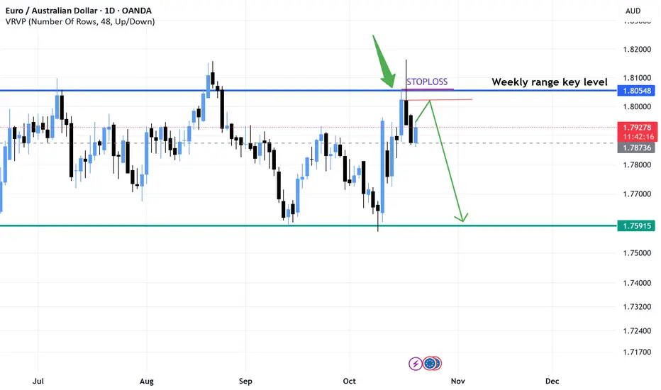 EURAUD price rejected fromt he resistace area and CLS candle was manipulated and price likely will go down .